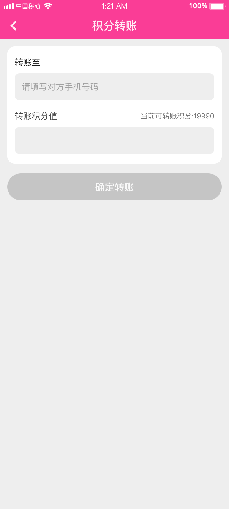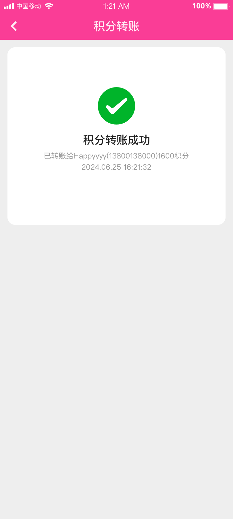 用戶可填寫(xiě)轉(zhuǎn)賬目標(biāo)用戶手機(jī)號(hào),填寫(xiě)轉(zhuǎn)賬積分后轉(zhuǎn)入目標(biāo)用戶積分賬戶;