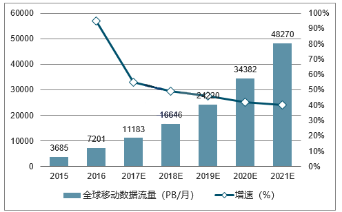 手機市場雖然增長速度變緩,但是手機流量卻達到了驚人的增速。從開始的2G時代到3G再到4G,直到即將進入的5G時代,中國手機網速實現了跨越式增長。網速的增快,直接促使了移動互聯網整體流量的上升,預計2016-2021年復合增長率約為46%!