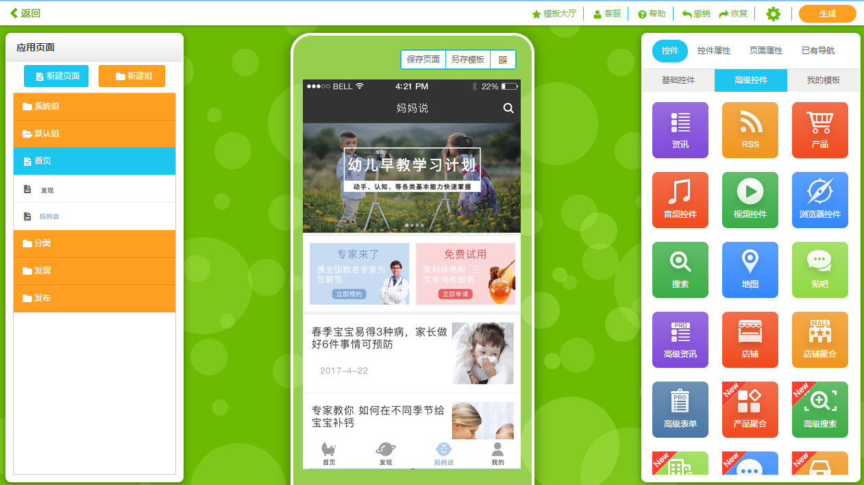 應用公園有很多母嬰類app模板,大家可以到應用公園官網進行下載或者制作體驗。作為國內靠前自助式app制作平臺,目前已經積累了上百套精美app原生模板,還有很多比如地圖、定位、新聞資訊、聊天等常見的app功能,無需編程,只需要拖拽移動,就可以對母嬰類app模板進行修改,從零開始搭建一個屬于自己的母嬰商城類app。