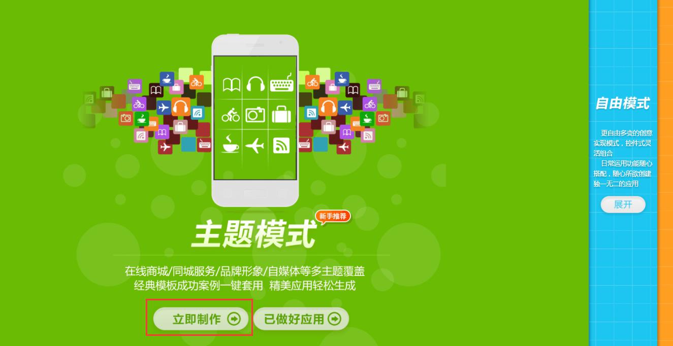 第二步:選擇商城APP開發模式,,這里選擇主題模式,可以借助應用公園的平臺已經做好的商城APP模板,可以一鍵套用,僅需對圖片文字進行修改即可。