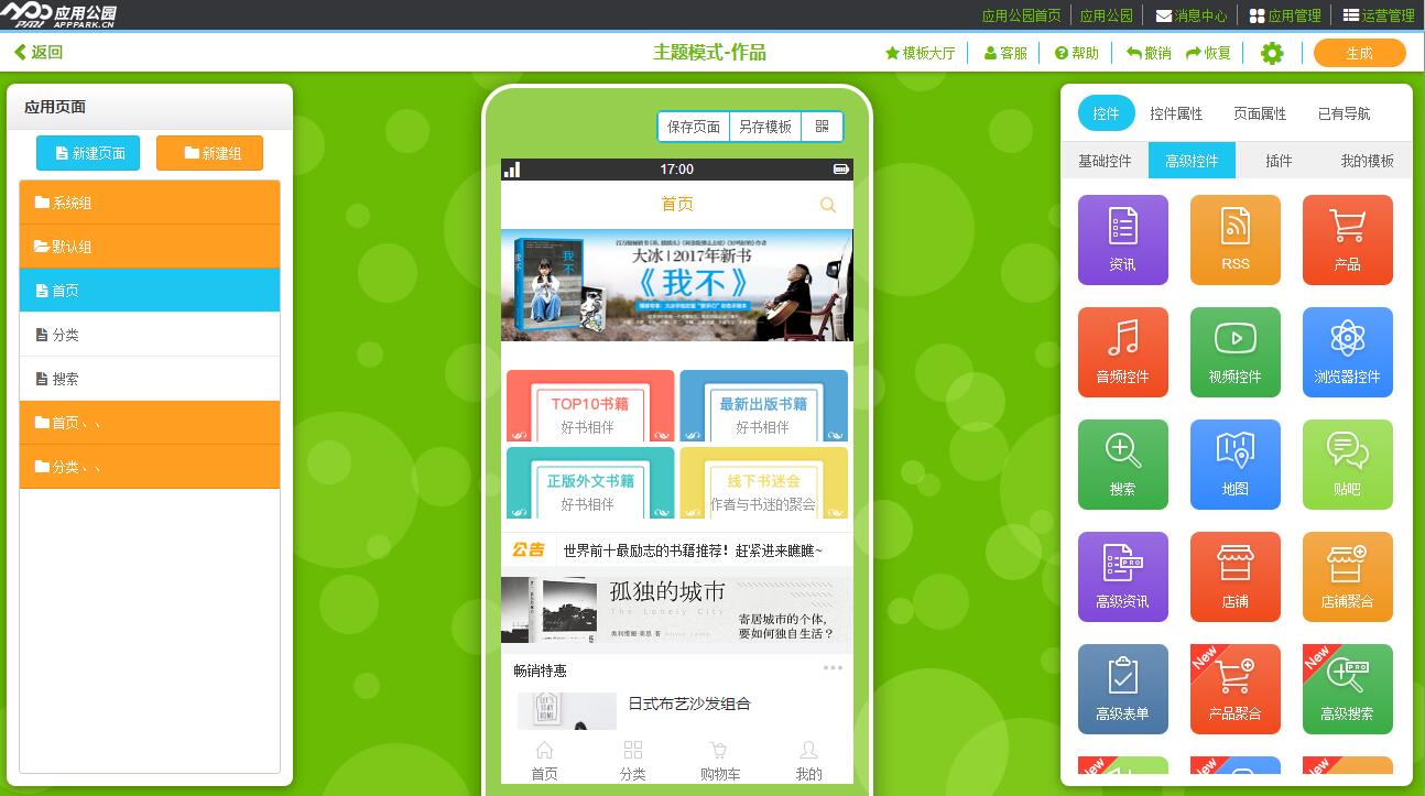 應用公園將常見的手機APP功能控件逐一開發(fā),比如圖文、視頻、導航分類、搜索、權限設置、付費閱讀、轉發(fā)分享、產(chǎn)品店鋪、地圖定位、貼吧社區(qū)、會員管理、子賬號管理等等。