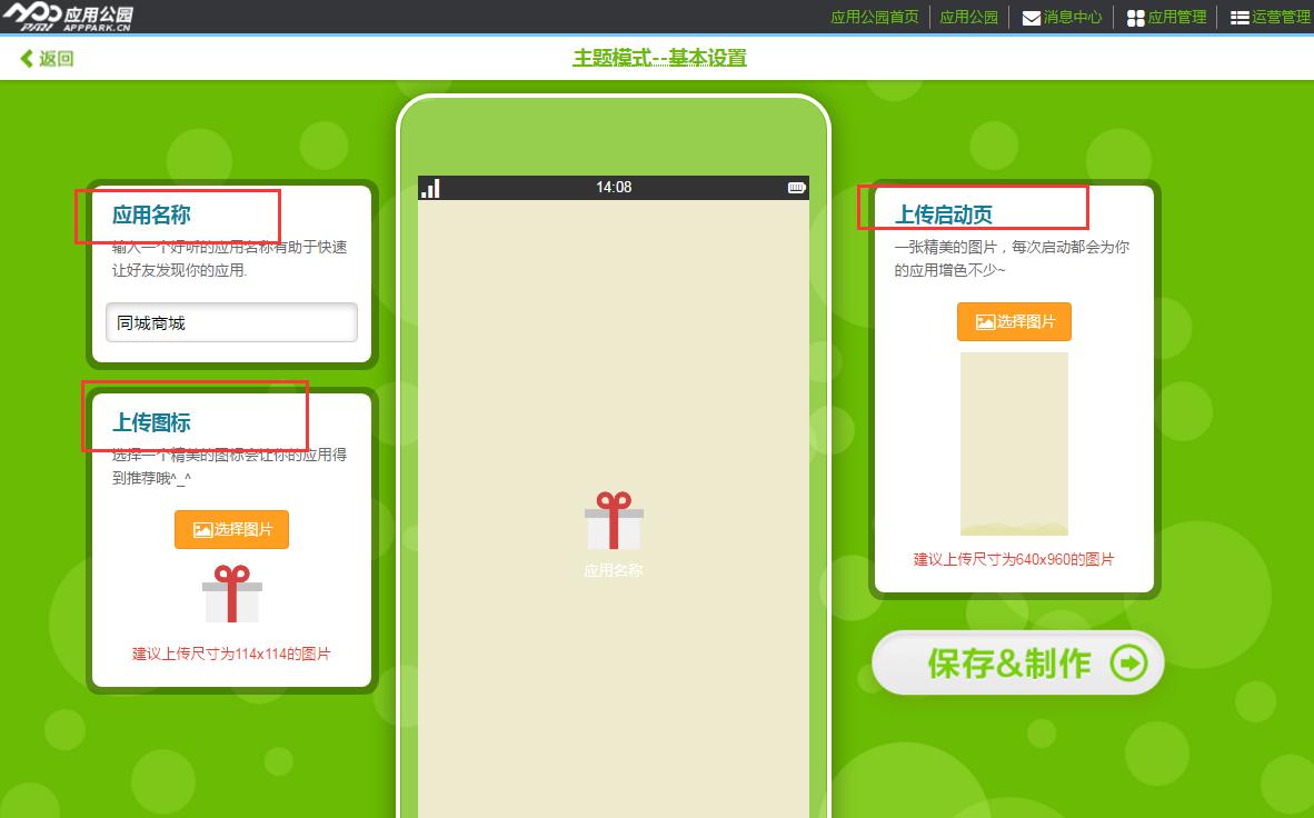 5、首先,設置應用的名稱、圖標、啟動的背景頁。應用公園官網提供部分參考。完成后點擊保存。