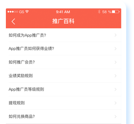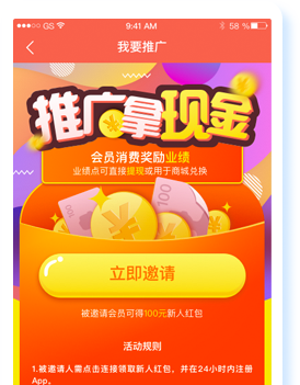 普通App用戶激活成為App推廣員后,分享相關鏈接邀請好友注冊App。好友成功注冊App之后在App中購買商品即可為推廣員提供相應的業績點返點。